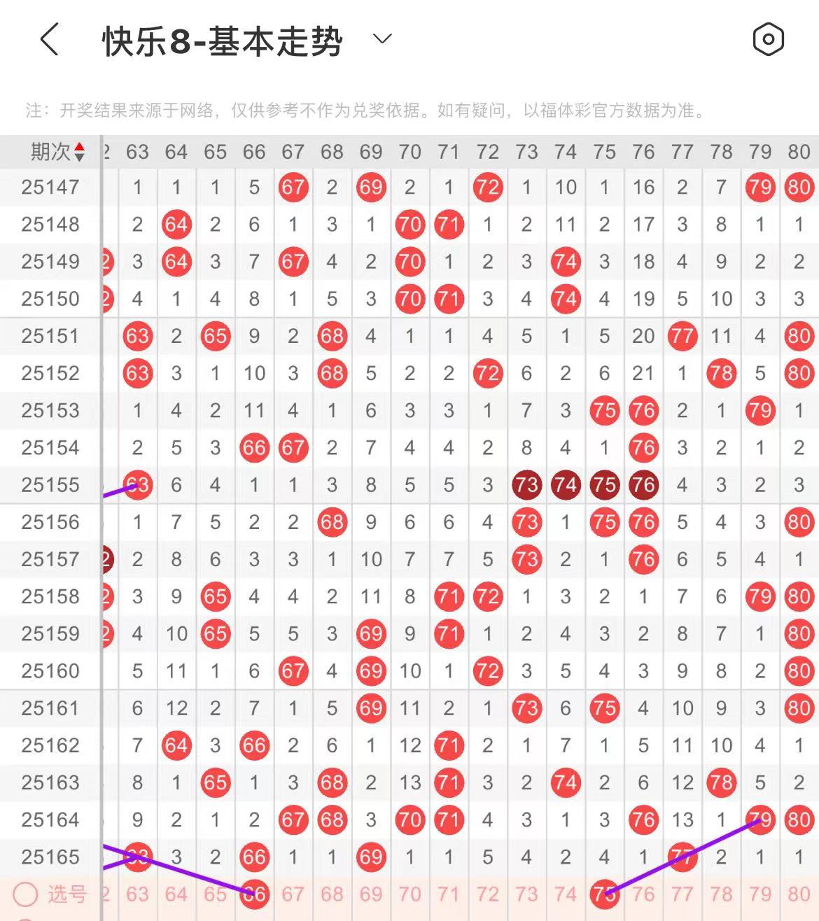 71-80区:本区间上期开出了一个号码,从号码走势图上看,该区跟6头区一样,可参考的号码走势甚少,注意出号个数减少的可能,在选号上建议以防为主。本期有出号走势的号码有75号,斜连出号走势。