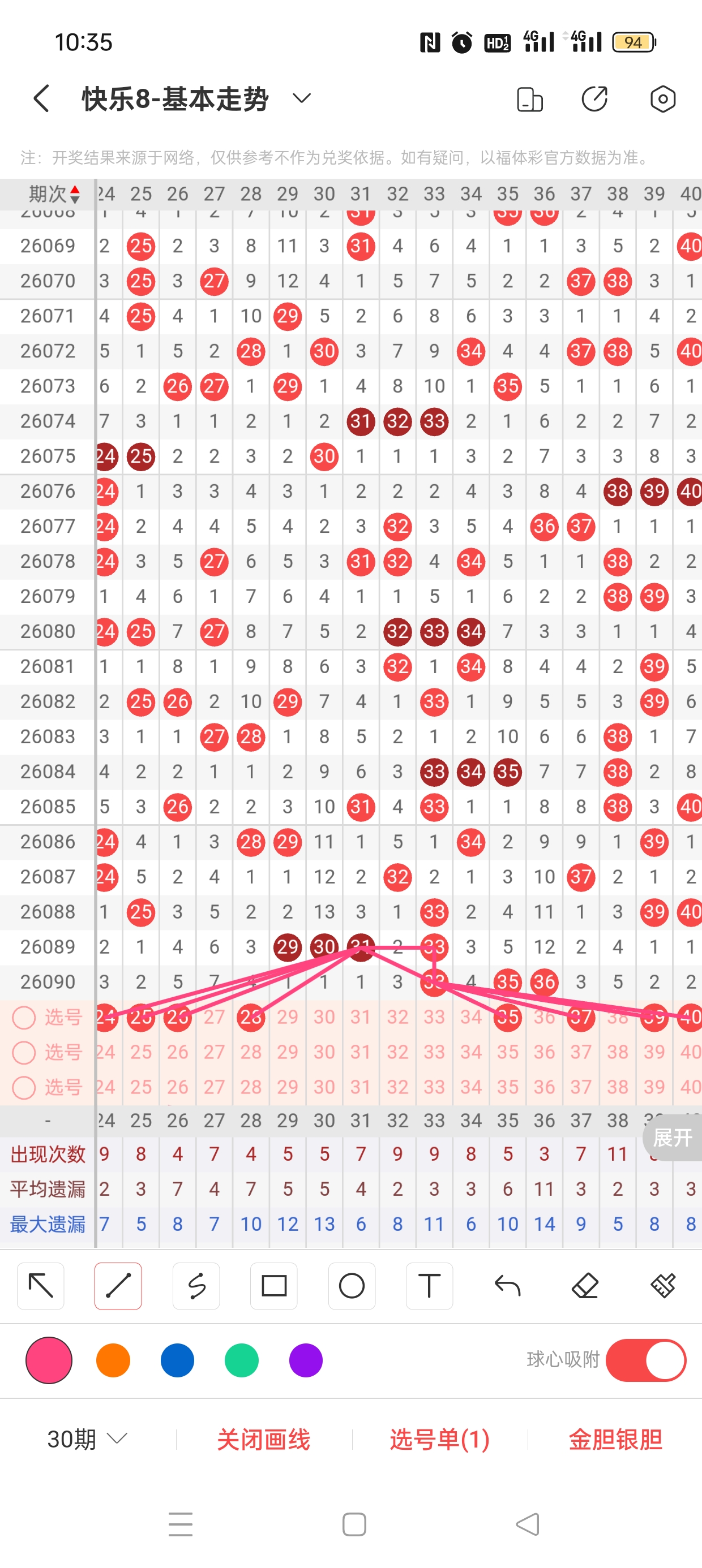 奇偶比10:10,和值767,区间比:5:4:5:6,同尾比值3:3:3:3,重号:33,连号35、36。总结完毕,下面开始本期分析。