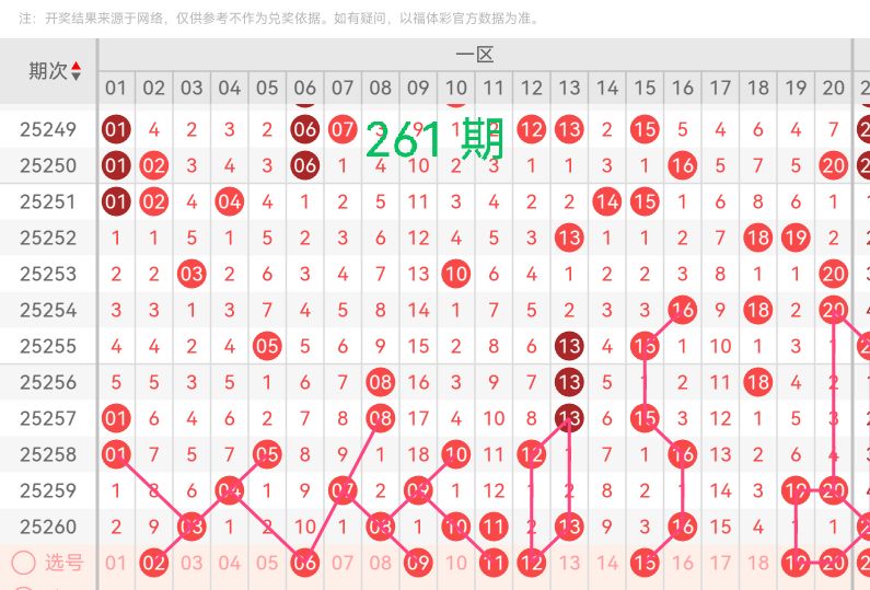 01-20区间,上期开出了6个号码(03 08 10 11 13 16),此区间出号较平稳,但短期内热度过冷,本期可能会保持一定程度的升温,预计有3-5个号码的开出空间。从历史数据来看,这个区间的号码往往呈现两种形态:要么是连续多期集中在某个小范围(如01-10段),要么就是呈现散点式分布。号码02遗漏9期,号码06遗漏10期,这几个号码符合遗漏回补规律,号码11和12、号码19和20这两组二连号在走势上较好,本期有望开出高明15在画线上面与前几期开奖关系密切,如下图所示,本期考虑这个号码会回补开出。因此综合推荐该区间号码【02 06 09 11 12 15 19 20】