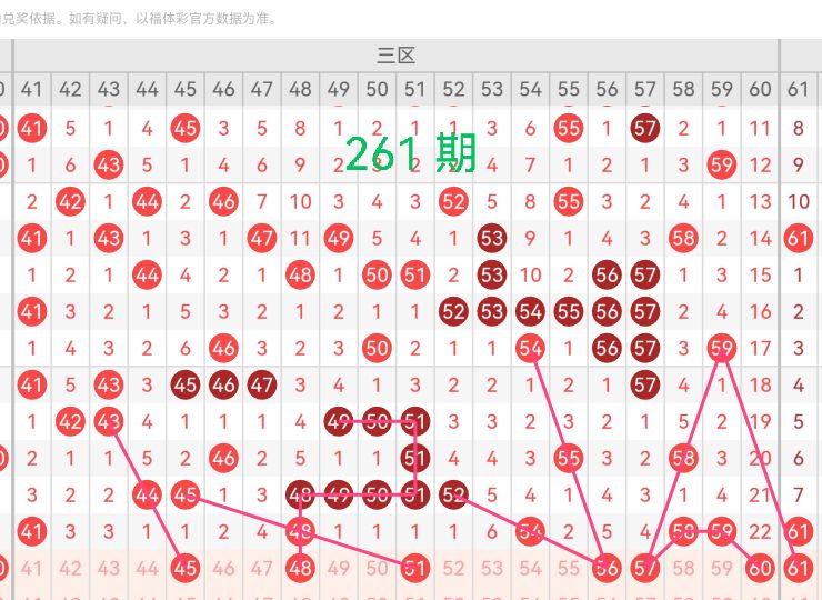 41-60区间在上期开出了5个号码(41 48 54 58 59),此区间出号较平稳,但是短期内过热。按照走势规律密集出号后往往会出现一定程度的回落,预计本期会减少开出3-4个左右。这个区间的号码特征比较明显,经常会出现遗漏号回补和重号的情况。前期开出的号码48这个号码,本期考虑以重号的形式再次开出。前期开出的号码58和59带动两个端点号码57和60的出现。号码56在画线上面走势较好,本期有望回补开出。因此综合推荐该区间号码【45 48 51 56 57 60】