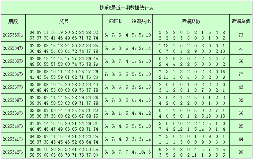 福彩快乐8第2025342期奖号为:05 06 10 22 25 33 41 42 53 55 58 59 60 63 66 70 71 73 77 80,其中奖号和值为969,跨度为75,四区比为3:3:7:7,奇偶比为11:9,遗漏总值为86,奖号冷温热码个数比为4:10:6。