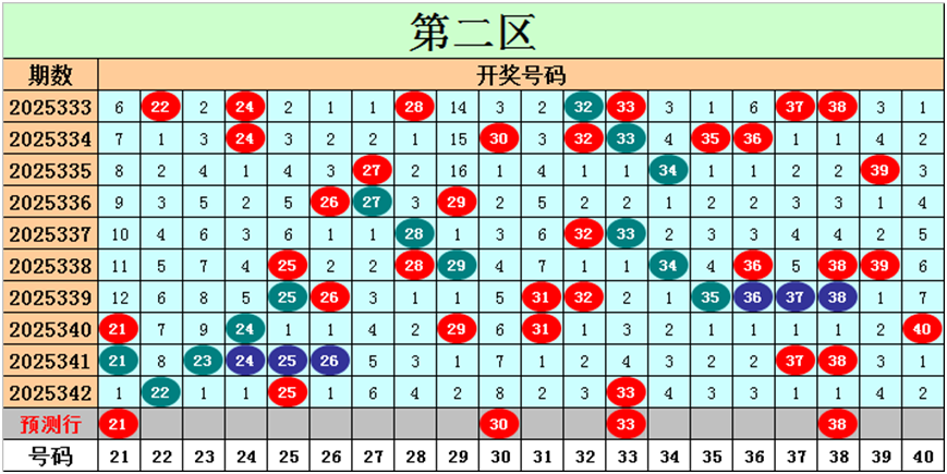 目前第二区包含12个热码:重码3个22、25、33,邻码5个21、23、24、26、40,孤码4个29、31、37、38;包含7个温码:邻码2个32、34,孤码5个27、28、35、36、39;包含1个冷码:邻码0个,孤码1个30;号码冷温热个数比为1:7:12,重号、邻码、孤码个数比为3:7:10。