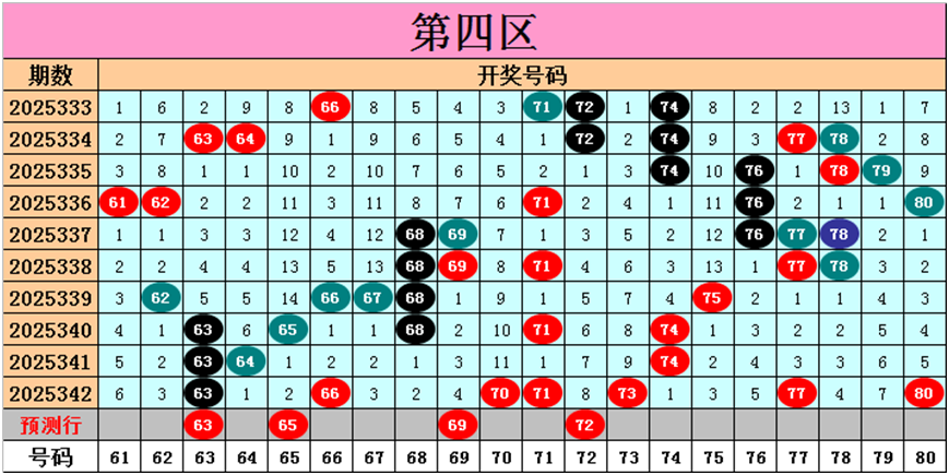目前第四区包含11个热码:重码7个63、66、70、71、73、77、80,邻码3个64、65、74,孤码1个68;包含7个温码:邻码6个61、62、67、69、76、78,孤码1个75;包含2个冷码:邻码2个72、79,孤码0个;号码冷温热个数比为2:7:11,重号、邻码、孤码个数比为7:11:2。