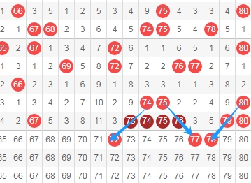 上图是福彩快乐8开奖号码走势分布图其中一部分,我标志出来的数字72 77 78都是斜连号码,其中数字72一直从数字74斜连下来,数字77一直从数字75斜连下来,数字78一直从数字80斜连下来,福彩快乐8一般喜欢出斜连号码的,你们能看中几个?