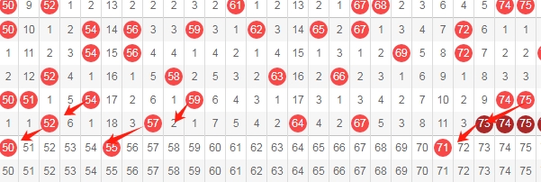 上图是福彩快乐8开奖号码走势分布图其中一部分,我标志出来的数字50 55 71都是跨度二斜连号码,其中数字50一直从数字54斜连下来,数字55一直从数字59斜连下来,数字71一直从数字75斜连下来,福彩快乐8一般喜欢出跨度二斜连号码的,你们能看中几个?