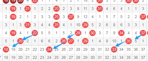 上图是福彩快乐8开奖号码走势分布图其中一部分,我标志出来的数字18 24 33都是跨度二斜连号码,其中数字18一直从数字22斜连下来,数字24一直从数字28斜连下来,数字33一直从数字37斜连下来,福彩快乐8一般喜欢出跨度二斜连号码的,你们能看中几个?