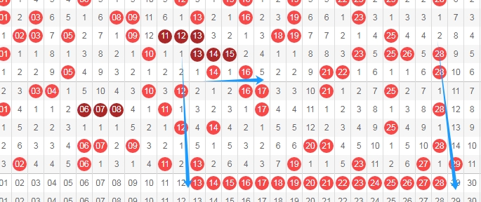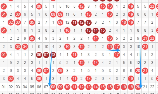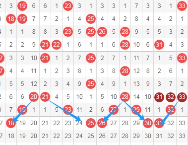 上图是福彩快乐8开奖号码其中一部分走势图,我在上面走势图中标注出来的数字18 25 26 30 31这三个数字你们有看好的不?看上面走势图中标注出来的蓝色箭头,其中数字18是从数字20一直斜连下去的,数字25是跨度二斜连从数字21,数字26是从数字28斜连下去的,数字30是从数字28斜连下去的,数字31是从数字33斜连下去的。