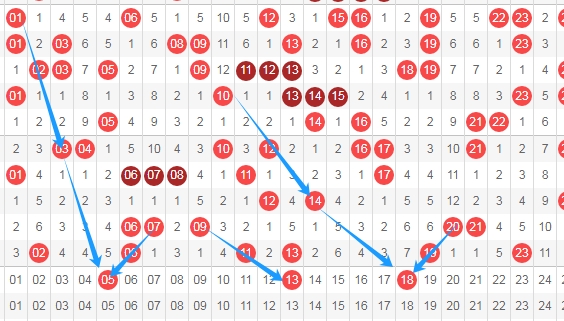 上图是福彩快乐8开奖号码其中一部分走势图,我在上面走势图中标注出来的数字05 13 18这三个数字你们有看好的不?看上面走势图中标注出来的蓝色箭头,其中数字05是从数字07一直斜连下去的,数字13是跨度二斜连从数字09,数字18是从数字20斜连下去的。