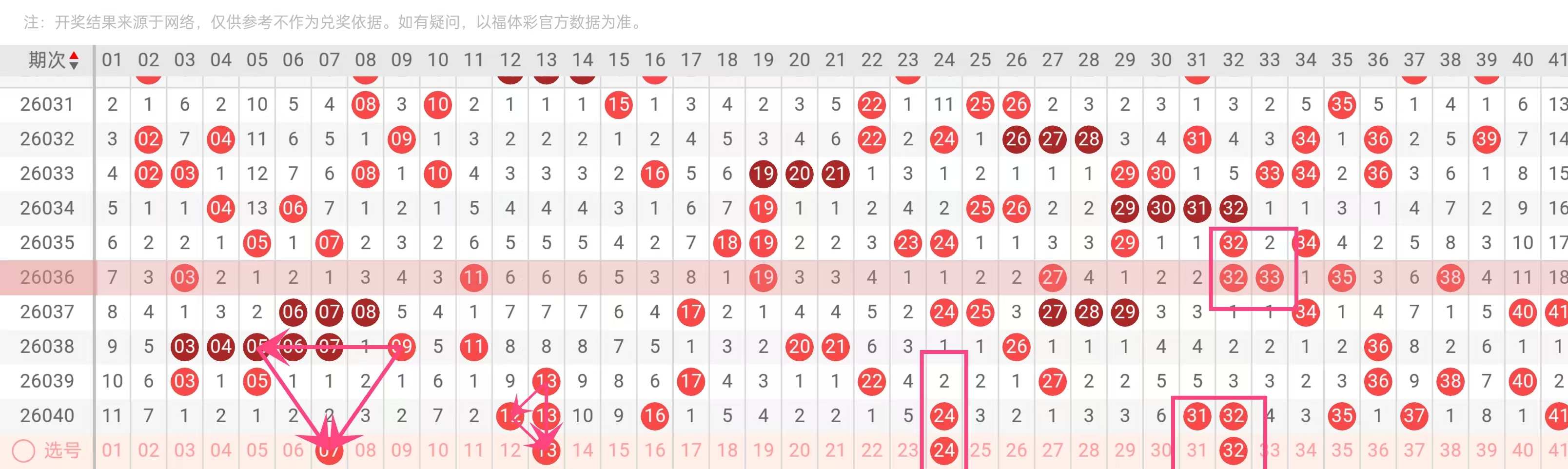 近5期出现3次,属于温偏热号。在30-39区间中,32与31、33、35等形成“三连号或对称出号”结构。该区近三期出号量稳定,32作为中间偶数,具有承上启下的衔接作用。