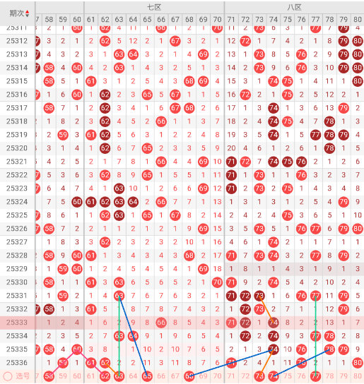 七区开出:61 62 奇偶比: 1:1 和值:123 跨度:1,上期开出2个号码,奇偶数号码均衡。本期三斜连走势:62,隔码斜连走势:65 68。近10期平均出号1.3枚,本期推荐关注号码:63、65。