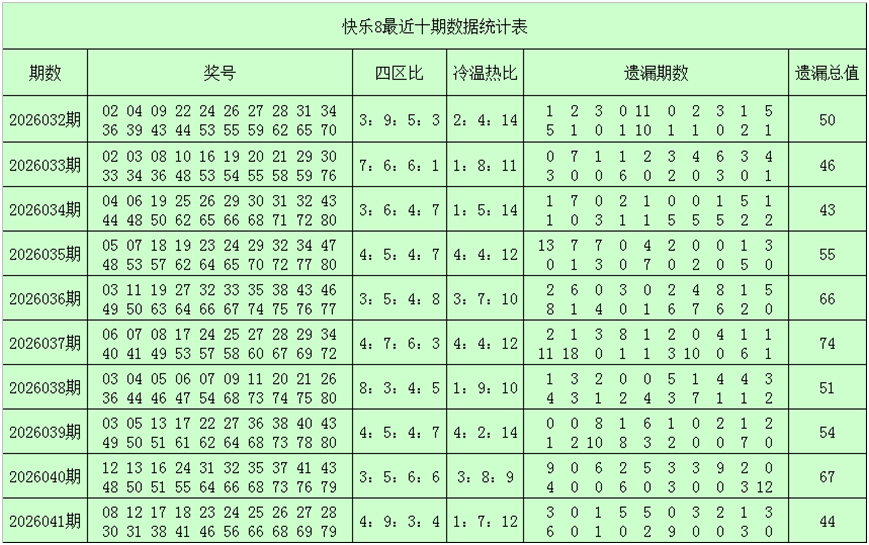 一、快乐8第2026042期奖号分析(定义:遗漏0-2期号码为热码,遗漏3-6期号码为温码,遗漏7期及7期以上号码为冷码,重码为上期开出奖号,邻码为上期没有出现,但与上期奖号差值为1的号码,例如上期开出奖号04,没有出现号码03和05,则本期03和05都为邻码,其它则为孤码。