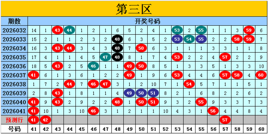 目前第三区包含9个热码:重码3个41、46、56,邻码1个55,孤码5个43、48、49、50、51;包含7个温码:邻码2个47、57,孤码5个44、53、54、58、60;包含4个冷码:邻码2个42、45,孤码2个52、59;号码冷温热个数比为4:7:9,重号、邻码、孤码个数比为3:5:12。