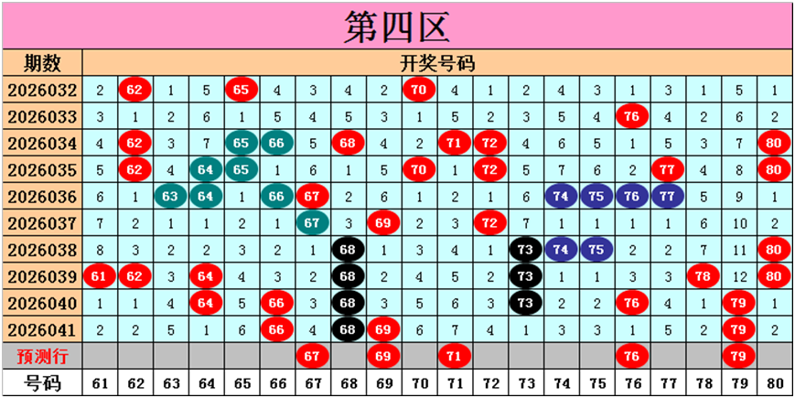 目前第四区包含11个热码:重码4个66、68、69、79,邻码2个78、80,孤码5个61、62、64、73、76;包含8个温码:邻码3个65、67、70,孤码5个63、72、74、75、77;包含1个冷码:邻码0个,孤码1个71;号码冷温热个数比为1:8:11,重号、邻码、孤码个数比为4:5:11。