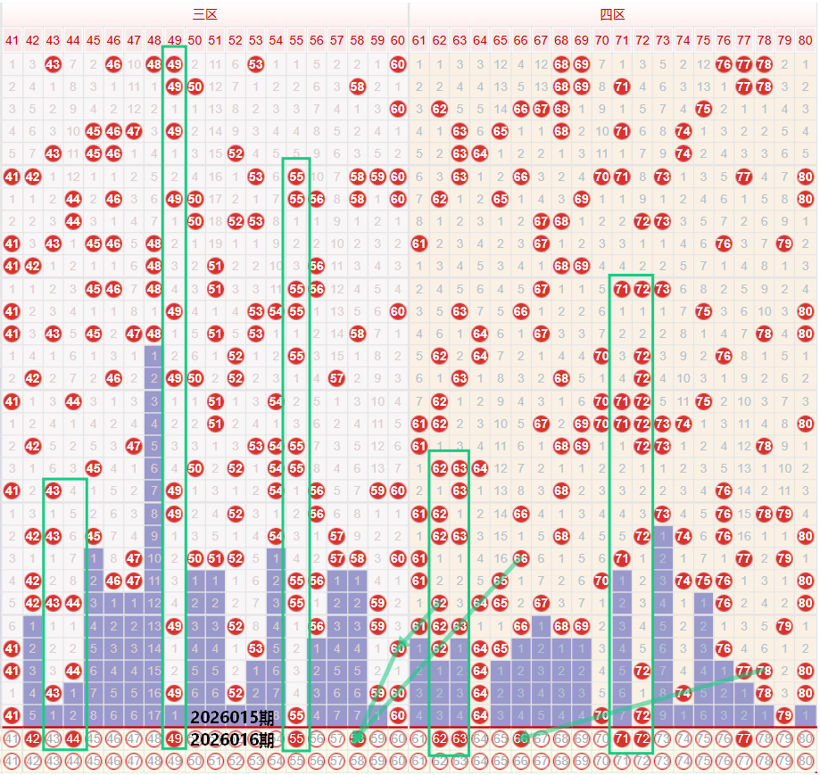 如图所示:在本期大数区的选号中注意在上期的走势中三区间开出了3枚中奖号码,落位在区间的最低位,目前的三区间落位走势依旧保持着较为散乱的走势,保持着较多的空位区间,近期注意多观察三区间的走势,不建议在三区间过多的做号,重点关注在上期开出41的位置注意42 44的向后延续走势,以及49 52的遗漏一期号码选择,后段位置注意在上期的55 60以及60 64中间空位注意号码回补,重点关注58 62 66的偶数延续走势,个人较为看好在61 62 63的位置回补连号走势,四区间上期开出4枚中奖号码,保持着64号的重号四期走势,以及79号的双夹号走势,本期注意在上期开出70 72的位置开出延续走势,同时本期注意关注叠号的多码走势。