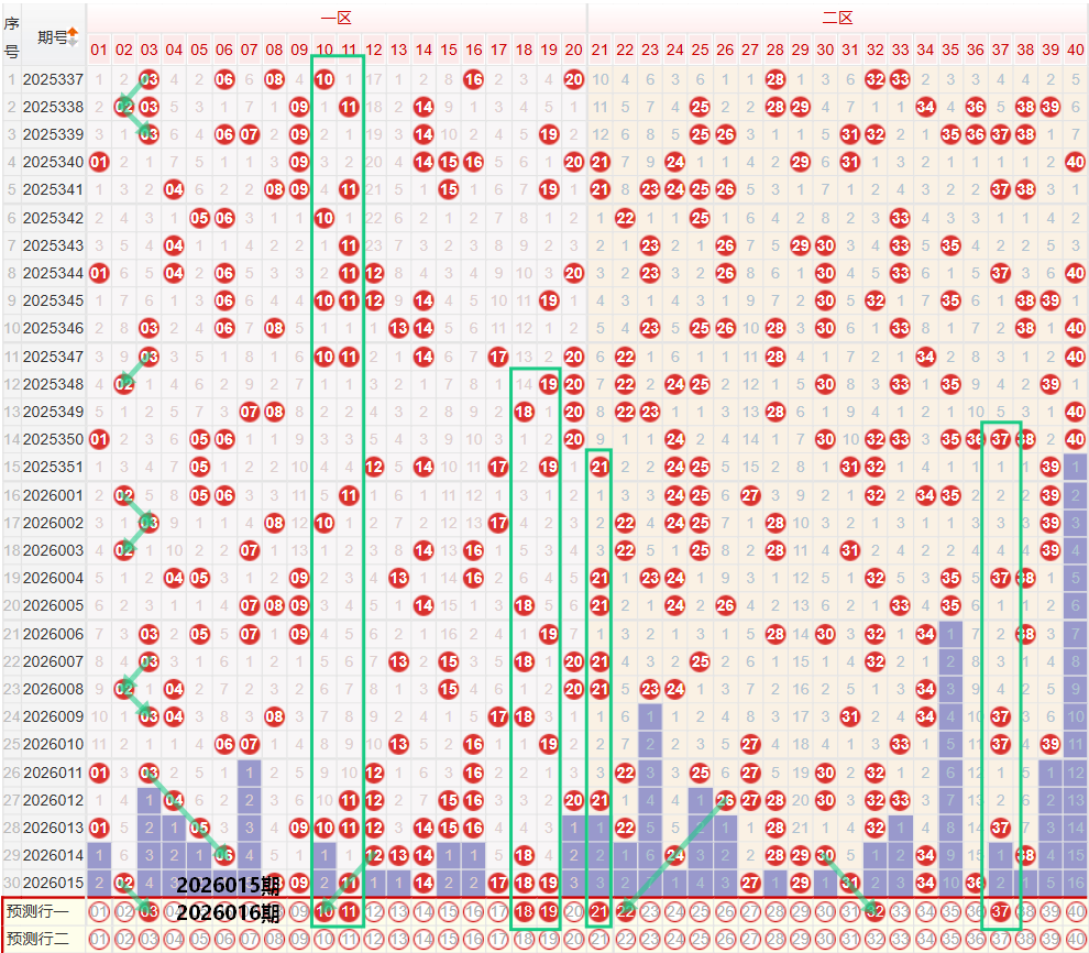 如图所示:在本期小数区的选号中,注意在上期的走势中一区间开出了8枚中奖号码,落位在区间最高位走势,在近期的走势中,一区间多次落位在高位走势,且多次开出连号走势,再上去的开奖结果中仅开出两组连号,均落位在一区间,同时形成08 09 18 19的区间同尾二连走势,由于近期的一区间热度较高,且重号的开出频率较高,本期建议在上期开出08 09 18 19的两组二连走势下方考虑一组直接走重的二连走势,个人较为看好18 19的二连走势直接走重,前段位置再上去开出02的位置下方,注意01 03的分边考虑,中段位置再上去开出09 11的位置注意10的夹号走势,以及10 11的二连继续保持延续走势,二区间上期开出了5枚中奖号码,在28 29 30的位置下方开出了27 29 31同步延续的奇数三连走势,本期注意26 32的单项延续走势,后段位置再上去回补36冷号的位置注意37 44的同步遗漏值2期走势,龙头位置如果本期考虑18 19的二连重号走势,建议在1/2区间衔接位置考虑一组假连形态的号码,个人较为看好18 19 21 22的假五连走势。