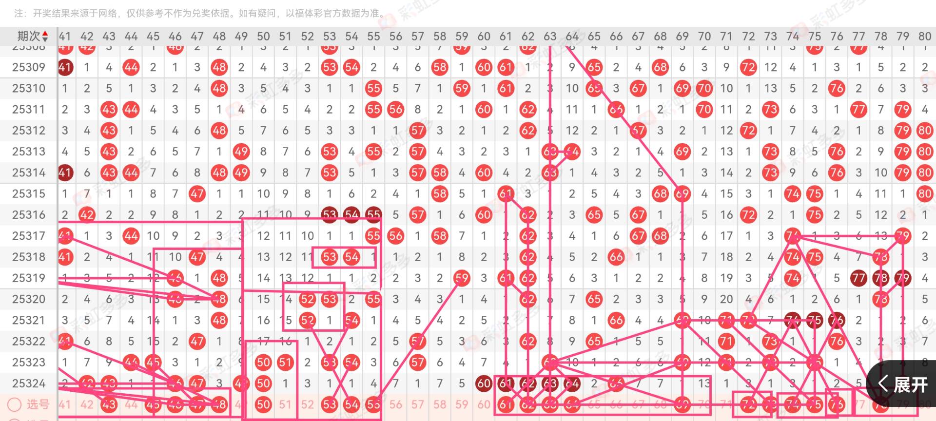 (4)区间分布: 将1-80个号码分为4个区间(1-20,21-40, 41-60,61-80)确保号码分布均匀不扎堆。
