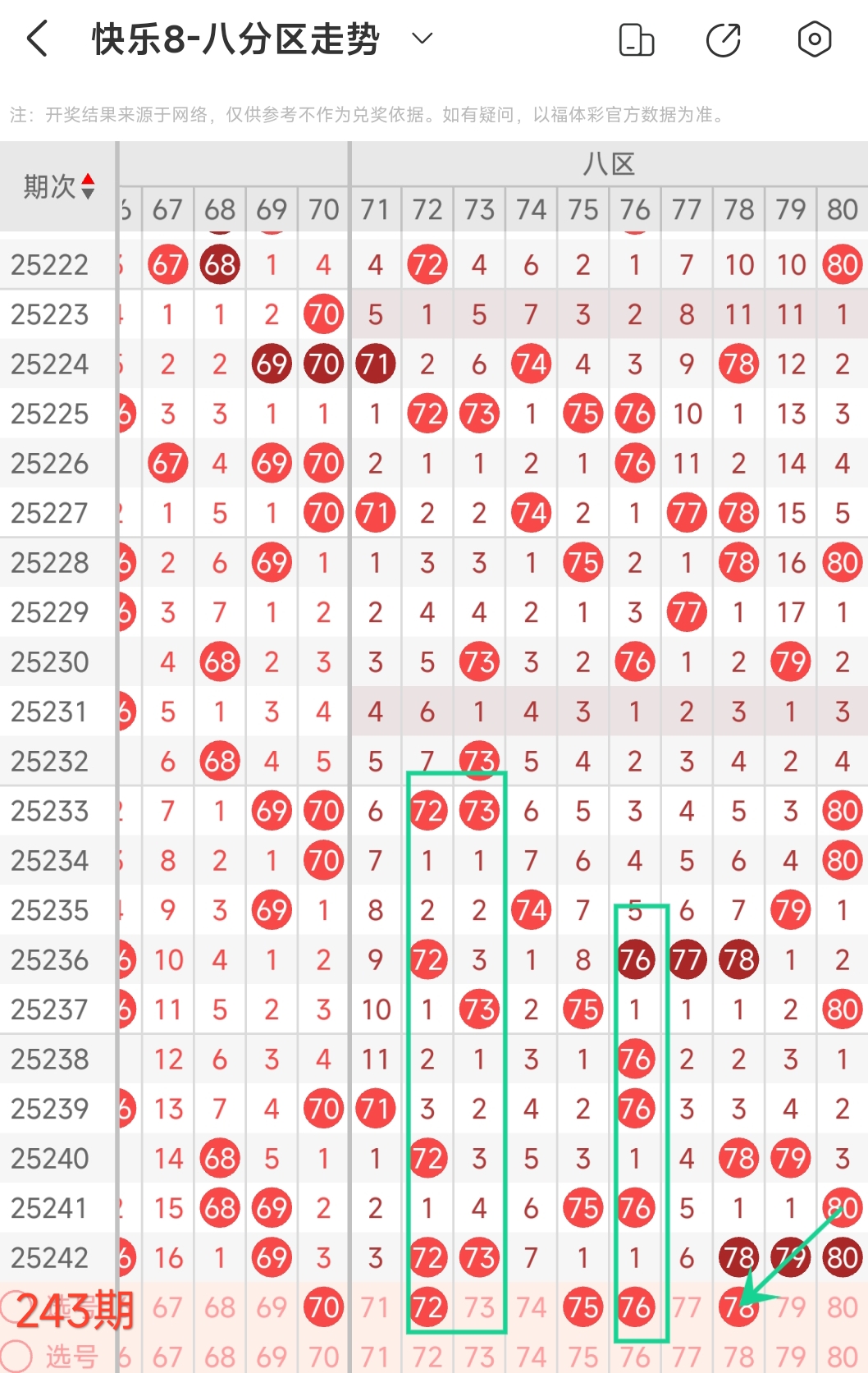 上期八区开出72 73 78 79 80这5个号码, 本期可以考虑2个左右