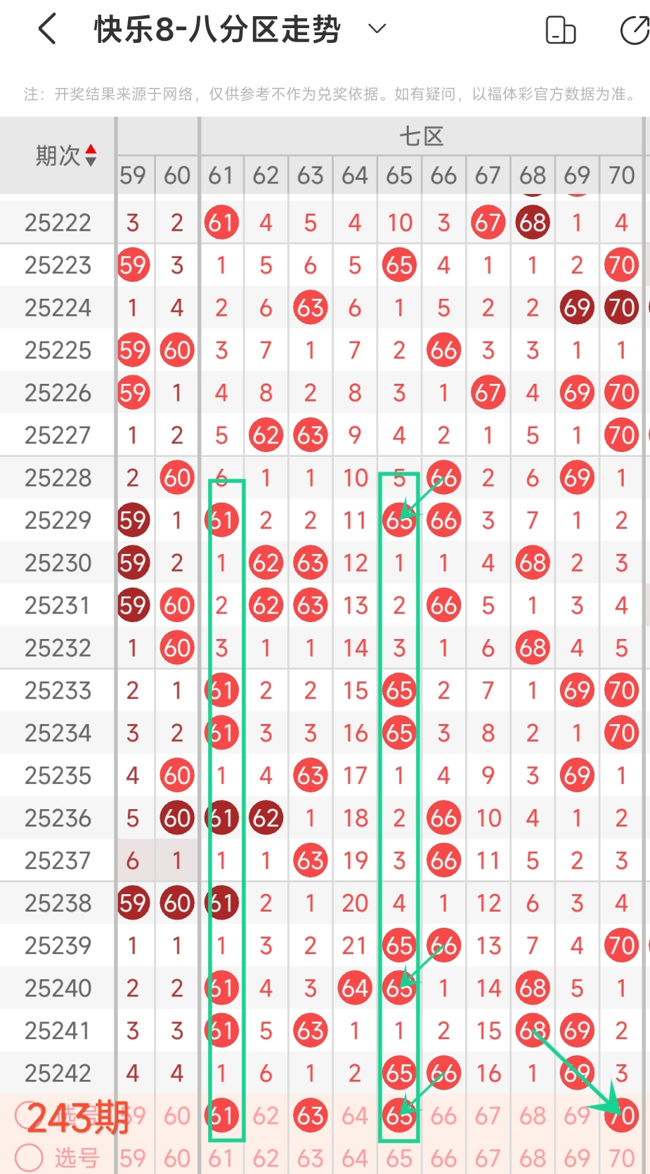 上期七区开出65 66 69这3个号码,本期考虑出2个左右。