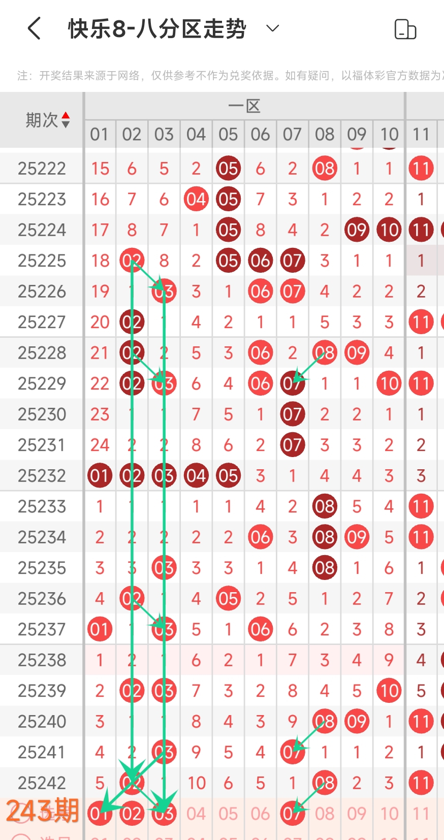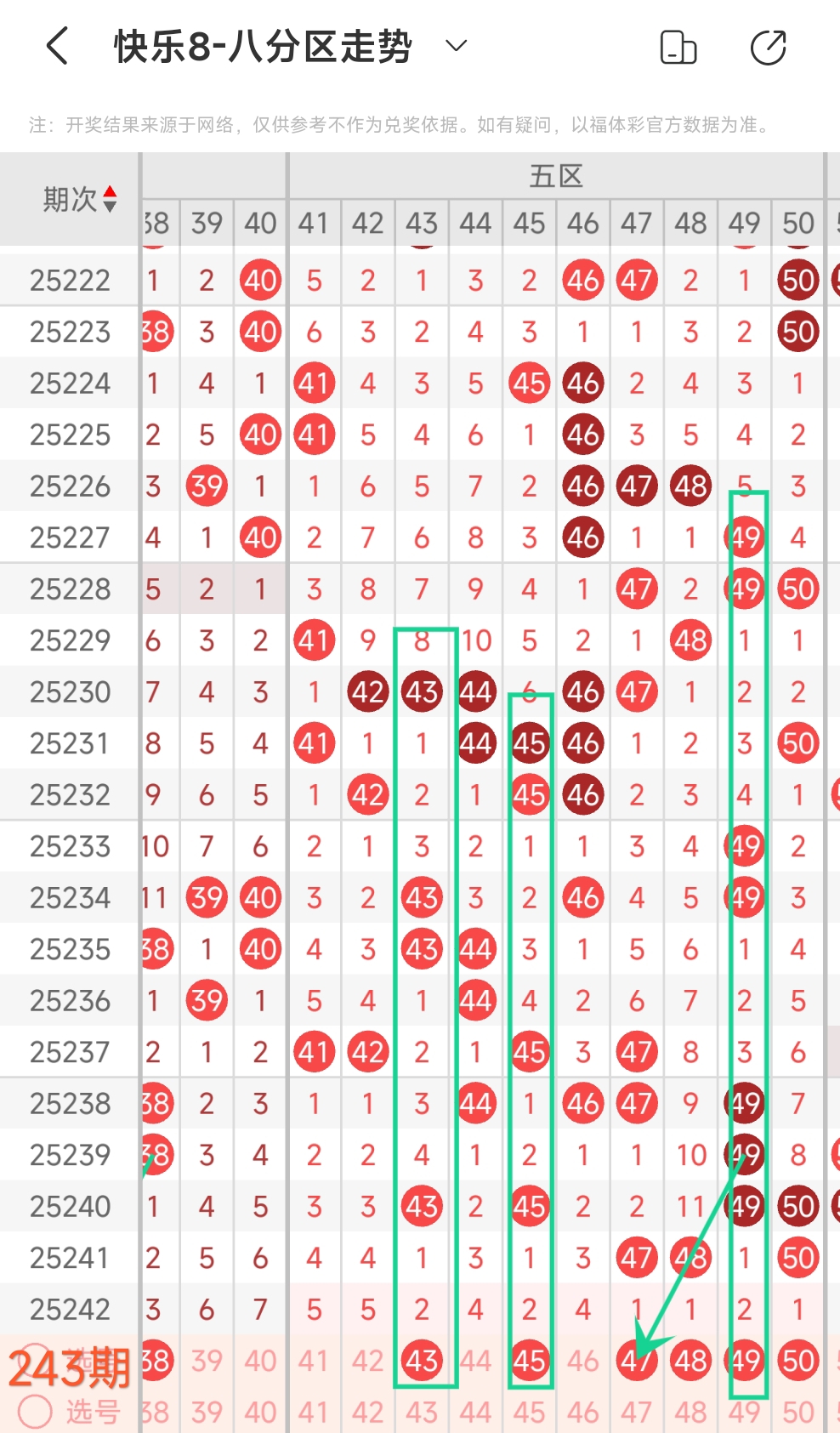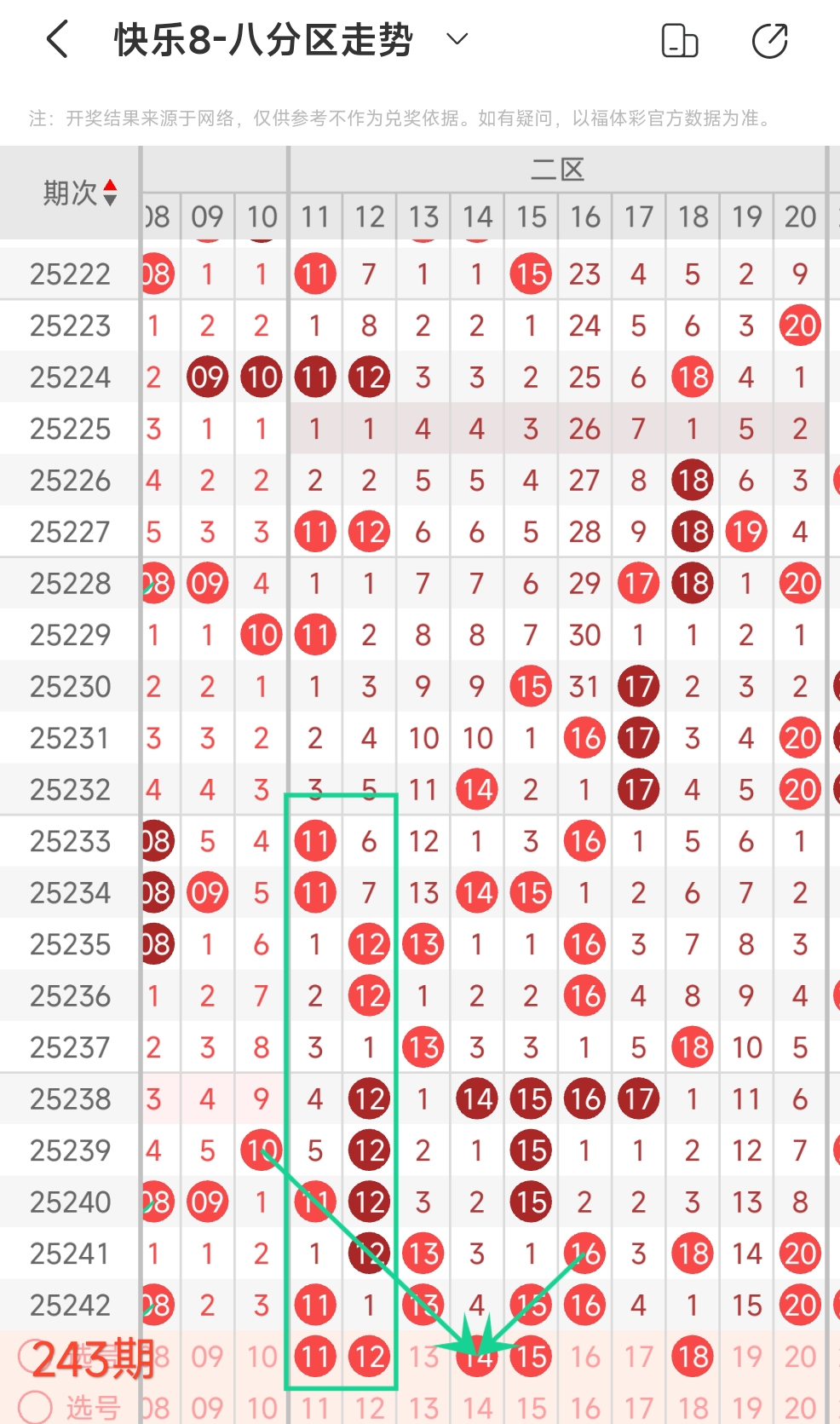 在快乐8的探索之旅中,通过对开奖走势图细致入微的观察,我们总结出一些具有参考价值的规律。几乎每一期开奖号码都呈现出以下显著特征:其一,大概率出现连号;其二,常常伴有边码;其三,遗漏值为1 2 3的号码频繁现身;其四,重号现象也较为常见。掌握这些要点,能为我们的投注提供方向指引。我们约定采用八分区走势图来展开分析。