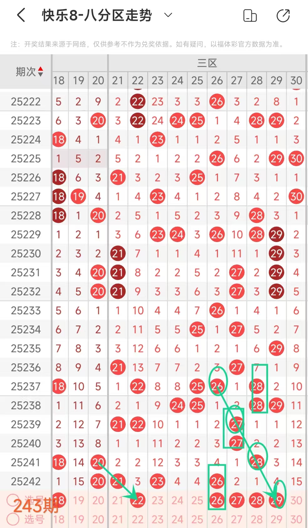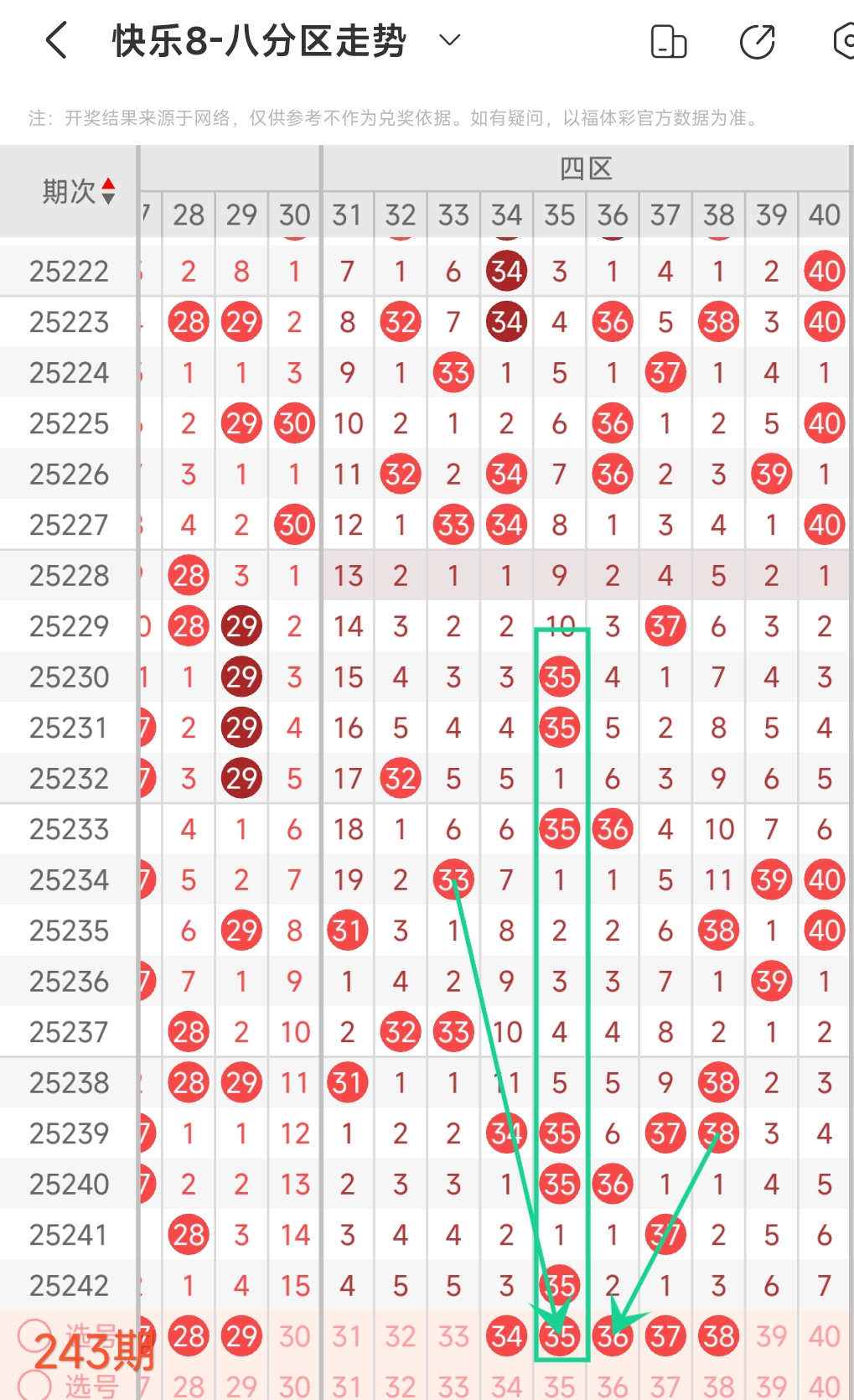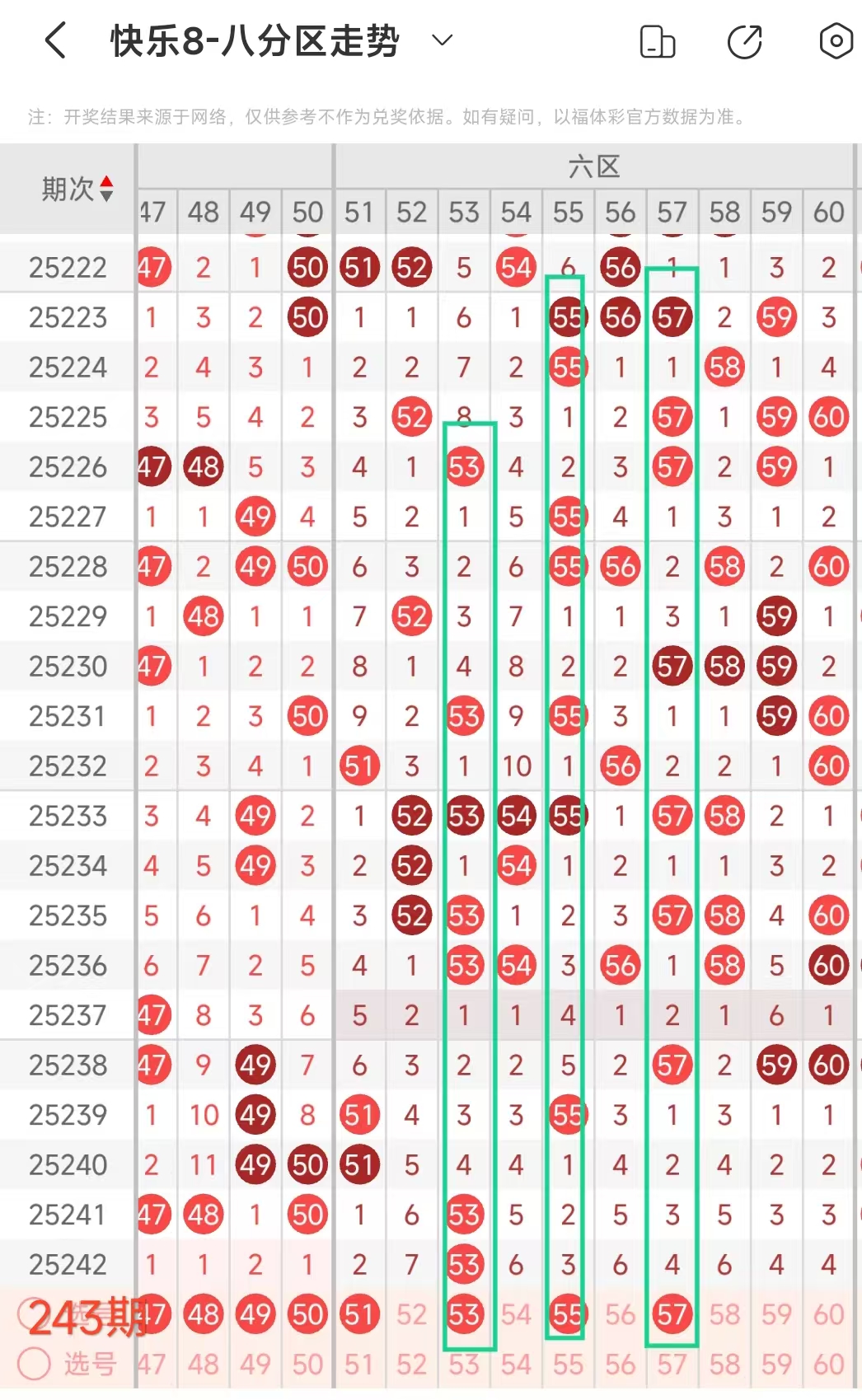 在快乐8的探索之旅中,通过对开奖走势图细致入微的观察,我们总结出一些具有参考价值的规律。几乎每一期开奖号码都呈现出以下显著特征:其一,大概率出现连号;其二,常常伴有边码;其三,遗漏值为1 2 3的号码频繁现身;其四,重号现象也较为常见。掌握这些要点,能为我们的投注提供方向指引。我们约定采用八分区走势图来展开分析。