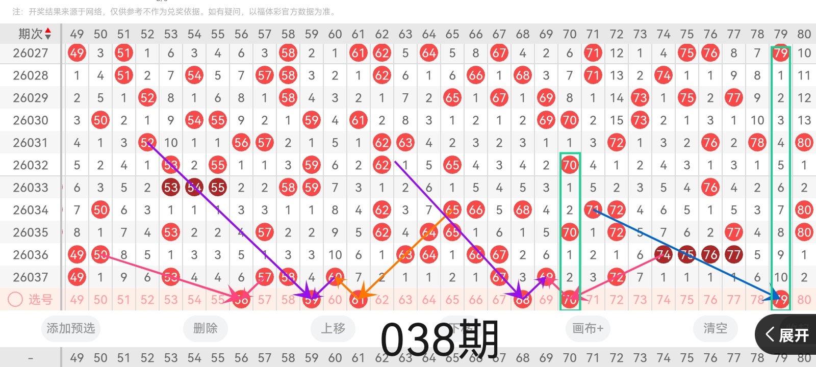 小梁根据上图中的画线思路分析得出:号码56与前几期开出的号码呈左斜连右斜三连的走势且呈隔六期回补的走位;号码59与前几期开出的号码呈隔四期回补的走位且呈左斜连右斜五连的走势;号码61与前几期开出的号码呈左斜四连右斜连的走势且呈隔七期回补的走位;号码68与前几期开出的号码呈左斜连右斜五连的走位且呈隔三期回补的走势;号码70与前几期开出的号码呈连续隔两期回补的走势且呈左斜三连右斜连的走位;号码79与前几期开出的号码呈右斜三连的走位且呈隔十期回补的走势。