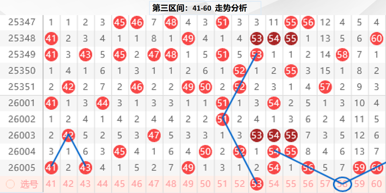 三区分析:【41-60】(走势图标注号码非小黄车大底,请谨慎参考,具体思路将在直播间分享讨论)