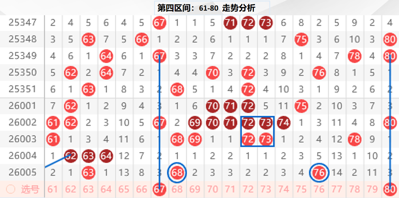 四区分析:【61-80】(走势图标注号码非小黄车大底,请谨慎参考,具体思路将在直播间分享讨论)