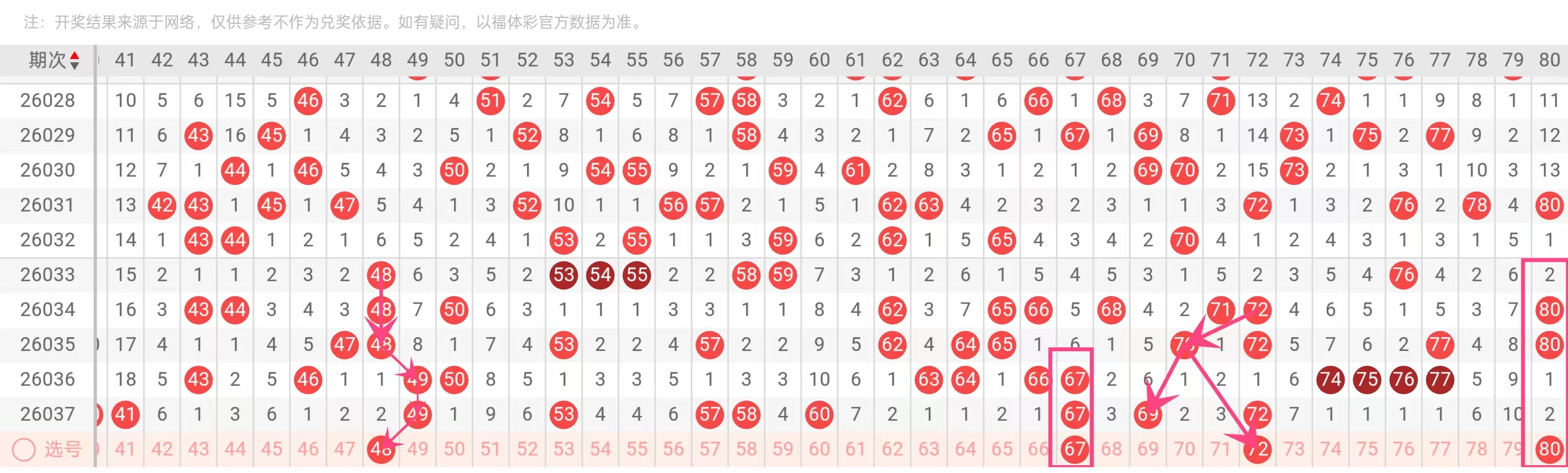 理由:大号热区与重号延续。67在近3期出现2次(2026036、2026037期),且常伴随66、68等大号出现。大号段(61-80)近期出号频率上升,67作为该区间活跃码,有望继续开出。