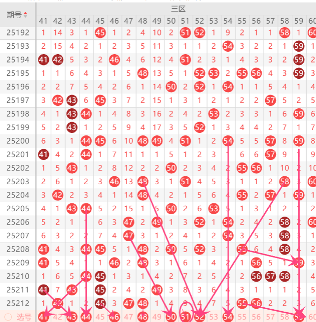 三区间在近期的走势上分析,上期三区间再次开出了6码,而且整体区间还是温冷形态走势,上期三区间开出的形态是斜连号和重码走势,那么本期三区间就要注意斜连号下的位置上的41.43号开出一码机会,切记做防守布局即可,而后半区的空位上的50.51.52.53.号中注意开出1-2码机会,而对称形态上的44.54.57.59中注意开出1-2码机会,如图所示。