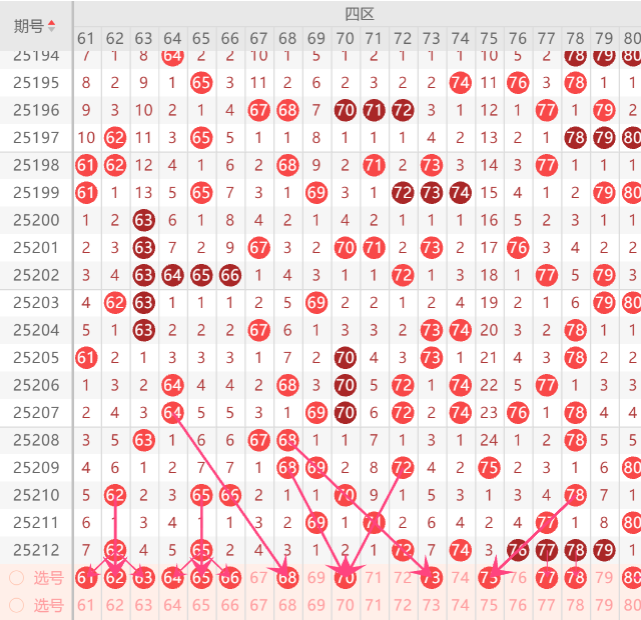 四区在近期的走势上来判断机会的话,整体区间上开始走热形态,上期四区间再次开出了8码,而上期区间开出的形态是斜连号和假六连走势,那本期四区间的重码上62.65.77.78.79号中注意1-2码走重机会,而斜连号下拉位置上注意73.75中开出一码机会,至于重码回补上的64.68.73中开出一码机会,如图所示。