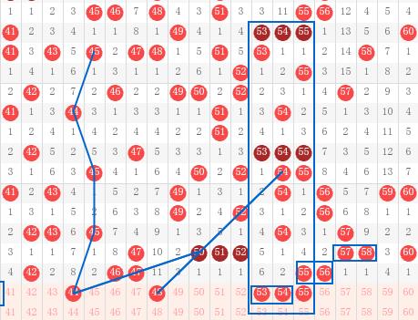 【第三区间41-60】:这个区间上期开出5个号码。本期推荐号码:44-48-53-54-55,44同路三期,再结合遗漏周来考虑,48为偶数斜连四期,53-54-55为5字头三码直连常见号码作防守。三区间推荐重点号码:53-54-55。
