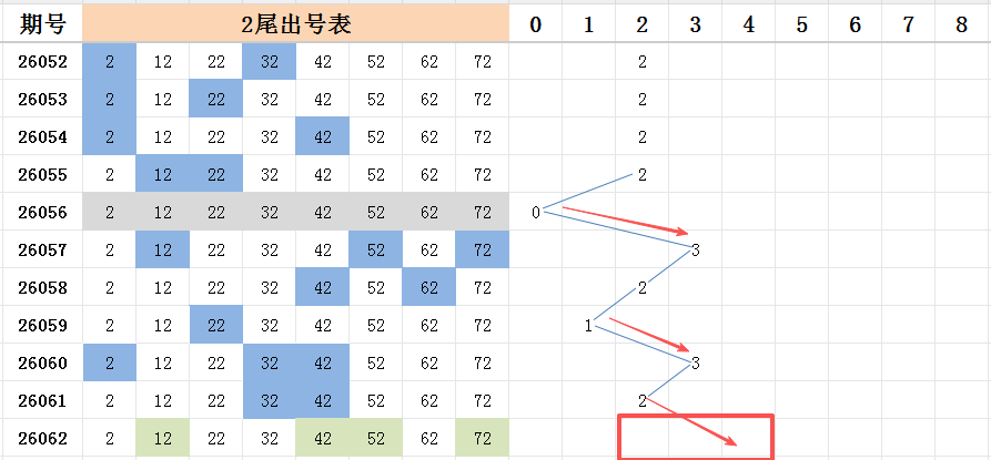 本期看好开出的范围是两码走势至四码走势之间。上期二尾开出两码走势,号码32和号码42是连续两期开出,本期看好这两个号码再次开出其中一码,走出三连号的号码走势。两个首码当中,看好号码12的开出,属于是二区的号码。两个尾码当中,看好号码72的开出,属于是八区的号码。