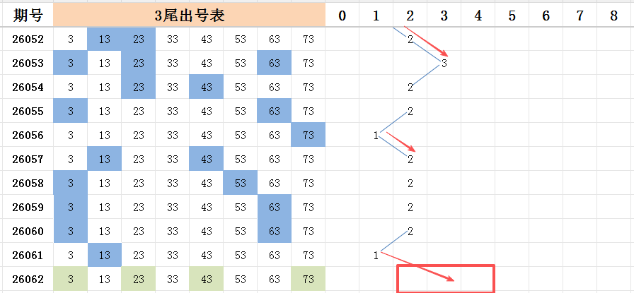 本期看好开出的范围是两码走势至四码走势之间。三尾上期开出一码走势,上期开出号码是13,本期看好号码13的两个邻码:号码03和号码23能开出其中一码,后半部分的尾号中,看好号码43和号码73的开出,分别是五区和八区的号码。