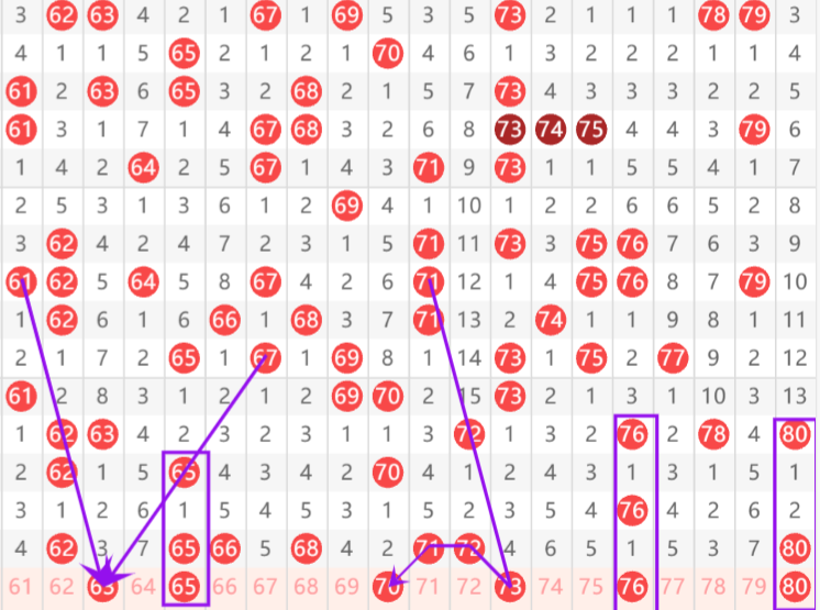 ⭐四区重点号码:63 65 70 73 80;防守号码: 76
