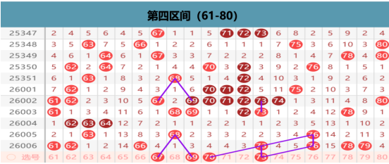 本区上期开出7码的区间布局,那么在本期我们考虑的就是61 62和78 79的连码出号,66 76的同尾,73 76 79的同路出号,那么在同路的位置上我们优先考虑的就是还是分边的出号,防守本身的出号点位,在66 73的位置上我们考虑的就是做一放一的出号原则,在空位的小周期的位置上我们也是要做择一出号的可能性的,68 69 70 71这个位置上我们做择一的出号,那么其他位置的出号就不是我们考虑的重点位置了。