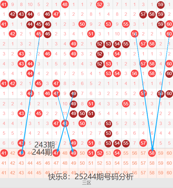 上期该区间开出号码:43 49 51 53 54 55 57,7个号码球,区间呈现热开,区间整体上目前是在热开的周期,号码出号近期也比较平均,分布相对与其他大区间来说很均衡,本期二区间个人预选号码:41号是遗漏6期号码,43号本期看重码的机会,47号是遗漏间隔2期的对称号码,均线三斜连落位点,49号本期看重码的机会,也是均线三斜连走势,51号本期看重码的机会,52号是遗漏8期的号码,54号本期也是看重码的机会,58号是遗漏7期号码,双线斜连的夹角落位点,通过以上分析,三区间终选号码:43 47 49 52 54 58。