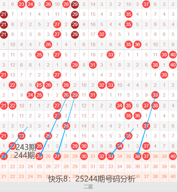 上期该区间开出:22 25 29 30 34 37,6个号码球,上期区间热开,二区间目前的状态整体可能要开始走温热状态,近期可以开始多关注区间内空位的回补形式,本期二区间个人预选号码:21号是遗漏1期的号码,三斜连落位点,25号本期看重码的机会,均线四斜连走势,27号是遗漏3期的号码,均线三斜连落位点,30号本期看重码的机会,32号和33号都是遗漏6期的号码,36号是遗漏3期的状态,均线三斜连落位点,37号本期看重码的机会,40号是遗漏8期的号码,通过以上分析,二区间终选号码:21 25 27 30 37 40。