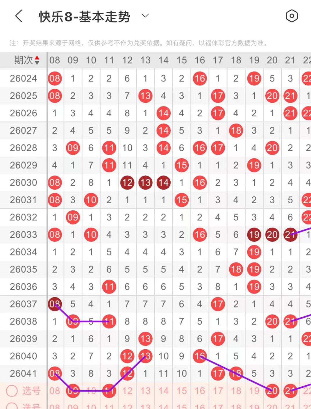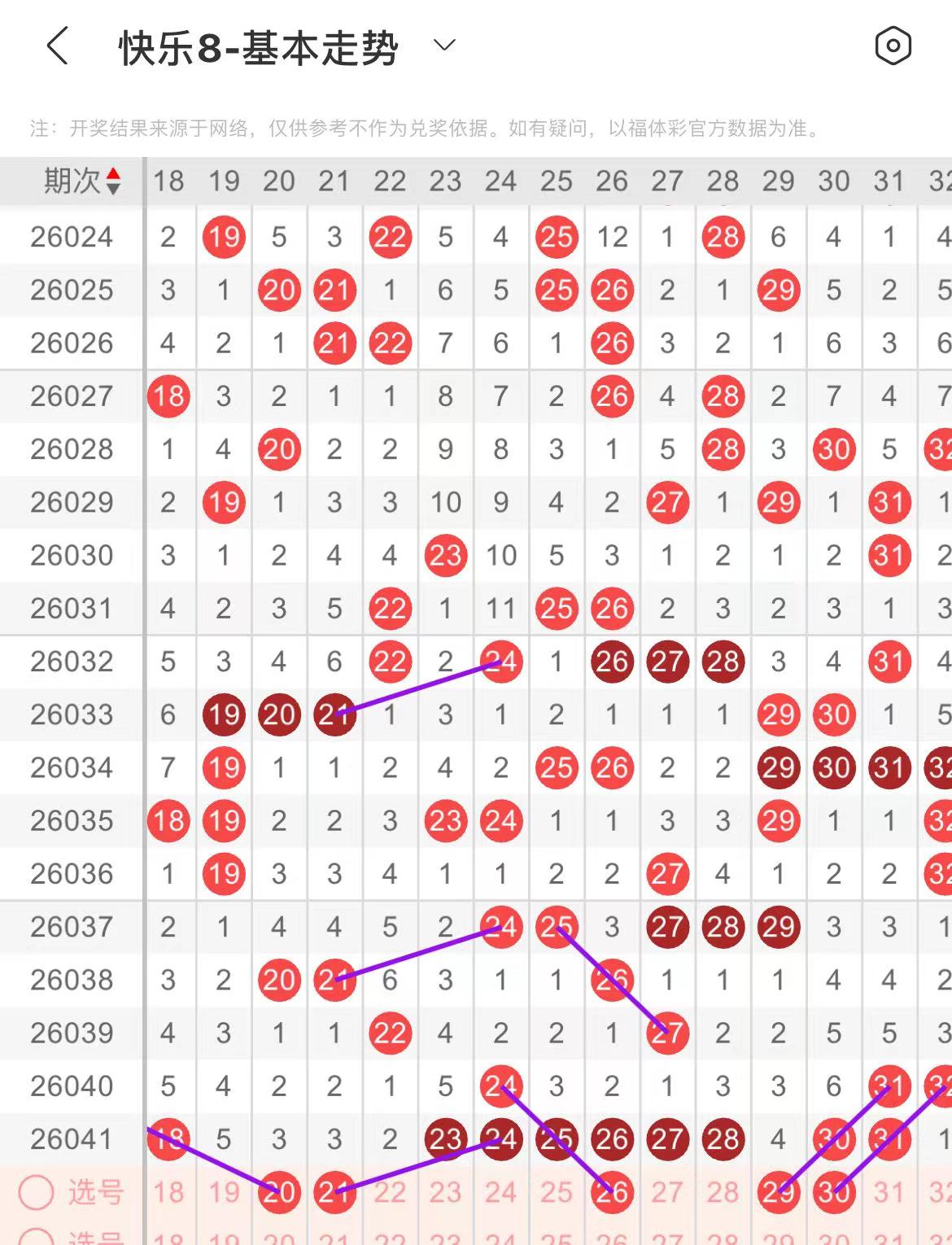 21-30区:本区间上期开出了七个号码,从号码走势图上看,本期号码走势依然强势,出号个数应该还能保持在三个号码左右,有出号走势的号码有21号,24对应21出号走势,26号,斜连出号走势,29.30号,平行斜连出号走势。