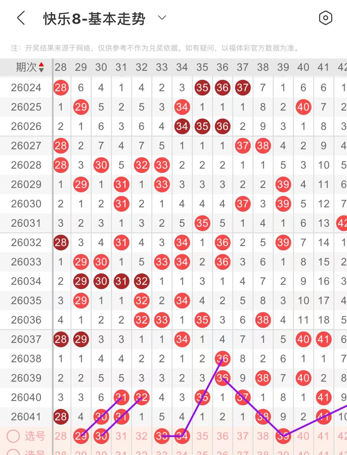 31-40区:本区间上期开出了两个号码,从号码走势图上看,该区现属于温号区,出号个数在两个号码左右,有出号走势的号码有34号,斜连出号走势,防33.34同出,39号,双线斜连出号走势。