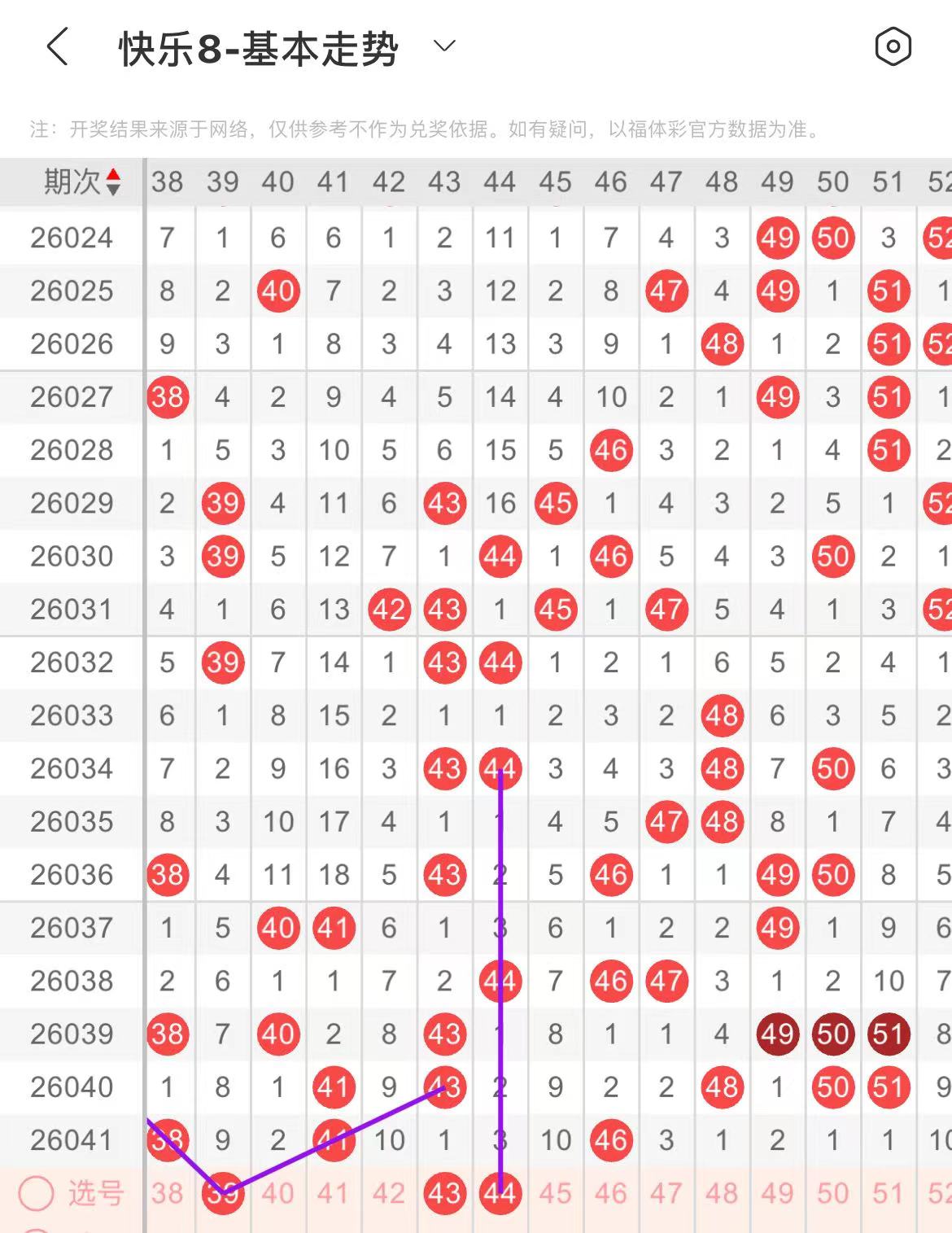 41-50区:本区间上期开出了两个号码,从号码走势图上看,本期重点关注形态号码开出,出号个数在两个号码左右。有出号走势的号码有44号,隔期相同出号走势,防43.44同出。