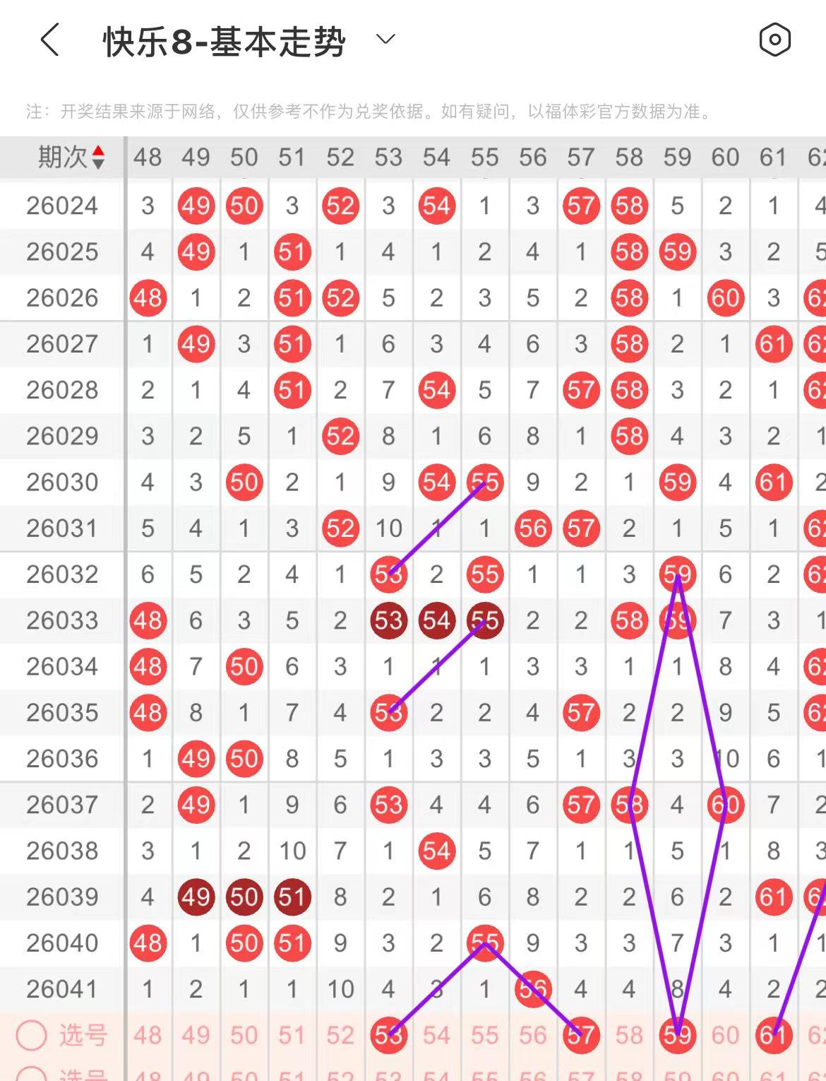 51-60区:本区间上期开出了一个号码,从号码走势图上看,本期出号个数在两个号码左右,有出号走势的号码有53号,55对应53出号走势,57号,斜连出号走势。59号,形成一个菱形走势形态。