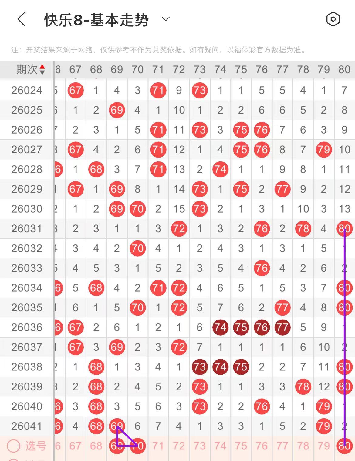 71-80区:本区间上期开出了一个号码,从号码走势图上看,本期号码走势趋势不明,有断区或者回补三个号码的可能,在选号上建议以防为主。本期有出号走势的号码有80号,形态对应出号走势,如出号个数在三个号码则考虑73.75.77开出。
