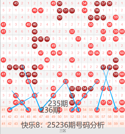 上期该区间开出号码:43 44 52 53 57 58 60,7个号码球,区间呈现热开,区间整体上目前是在热开的周期,号码出号近期也比较平均,分布相对与其他大区间来说很均衡,本期二区间个人预选号码:42 45 47 50 52 53 56 59 60,42号是遗漏3期的号码,均线三斜连落位点,45号是三斜连走势,也是遗漏3期号码,47号是双线斜连的夹角落位点,遗漏5期号码,50号是遗漏4期的号码,均线斜连走势,52号和53号两码本期看重码的机会,56号是遗漏间隔3期的对称状态,均线三斜连走势,59号是遗漏4期号码,均线三斜连落位点,60号本期看重码的机会,通过以上分析,三区间终选号码:42 45 47 50 53 56 60。