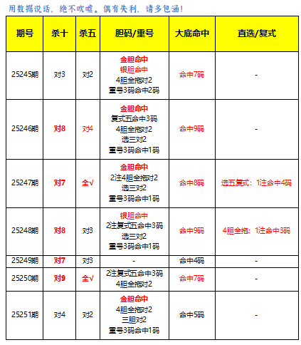 上期杀10码对6,免费文章杀5码对3,银胆命中,复式五命中3码,4胆全拖对2,三胆对2,重号3码命中1码,大底推荐命中9码,本期再接再厉。