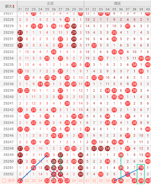 四区开出:33,37 奇偶比: 2:0 和值:70 跨度:4,上期开出2个号码,奇数号码占优势。本期三斜连走势:38 40,隔码斜连走势:35,近10期平均出号2.3枚。本期推荐关注号码:35、36、39。