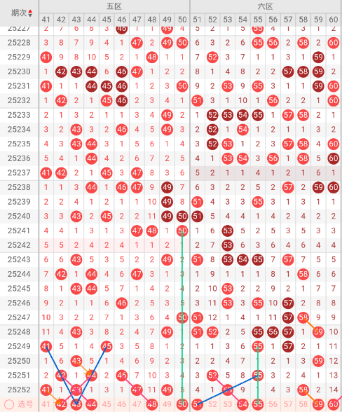 五区开出:41,43,47,49 奇偶比: 4:0 和值:180 跨度:8,上期开出4个号码,奇数号码占优势。本期三斜连走势:42 44 48,隔码斜连走势:43。近10期平均出2.1枚,本期推荐关注号码:42、43、48、50。