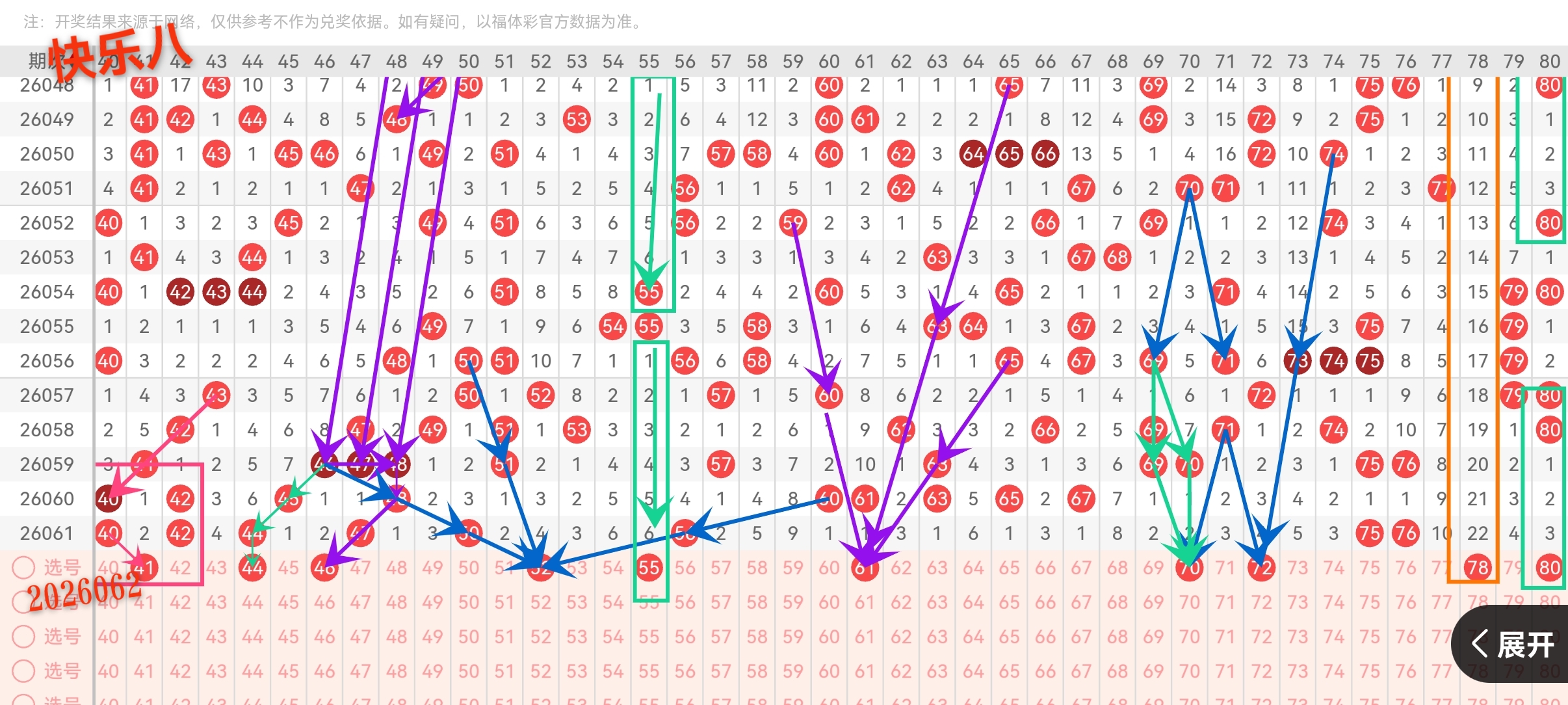 70:70是一个整十数,整数在快乐8的开奖中一直是个值得留意的类型。上期四区号码集中在75以后,70之前的大片区域是空的。70可以看作是填补这片空白区域的一个代表。它距离上期开出的75不算太远,可以作为号码区间向前扩展的一个支点。整数号加区域回补需求,让70有了理由。