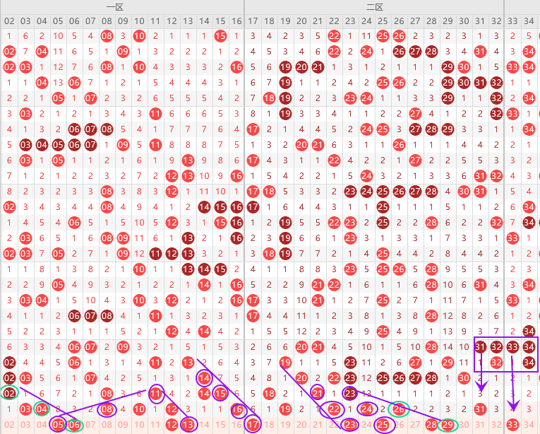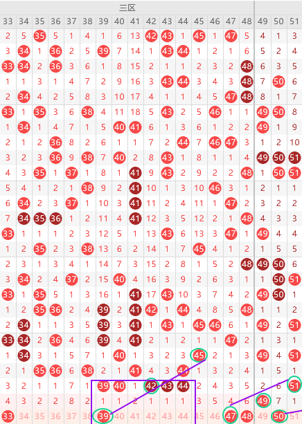 三区胆尾3尾8尾,上期断区,本期边号只有48,形态上39 47是斜连号,上图已勾画,遗漏值33 43 47三出一,结论关注五码 33 39 43 47 48防34
