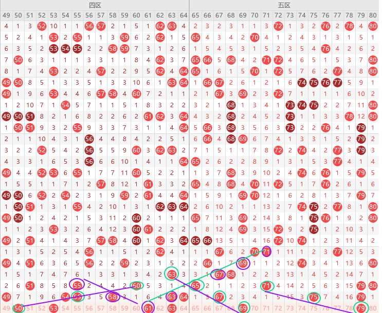 五区胆尾5尾9尾,边号66 68 74 76 78 80出1-2码,重号67 75 79三出一,形态上69 79是斜连号,上图已勾画,缩小范围重号杀掉67,那么如果有重就是75 79二出一,优先看75,边号防冷号78,短期规律隔一期号出多期,本期隔一期号,65 71 80三出一,昨天71金胆没出,本期可以防一期,本期五区大概率走热,出4-5码,遗漏值70 77二出一,结论关注五码68 70 71 75 78防77