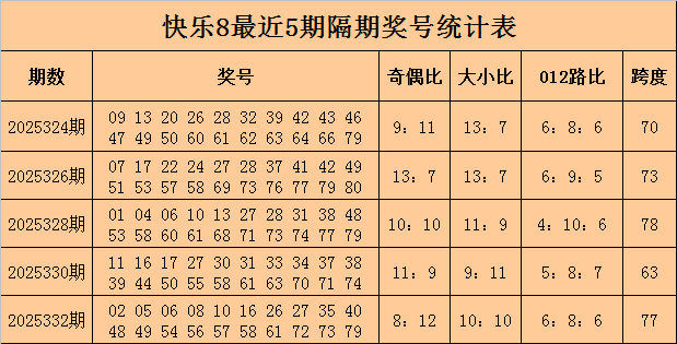 福彩快乐8第2025332期开奖回顾:02 05 06 08 10 16 26 27 35 40 48 49 54 56 57 58 61 72 73 79,其中奖号奇偶比开出8:12,大小比开出10:10,012路比开出6:8:6,和值为782,跨度为77。